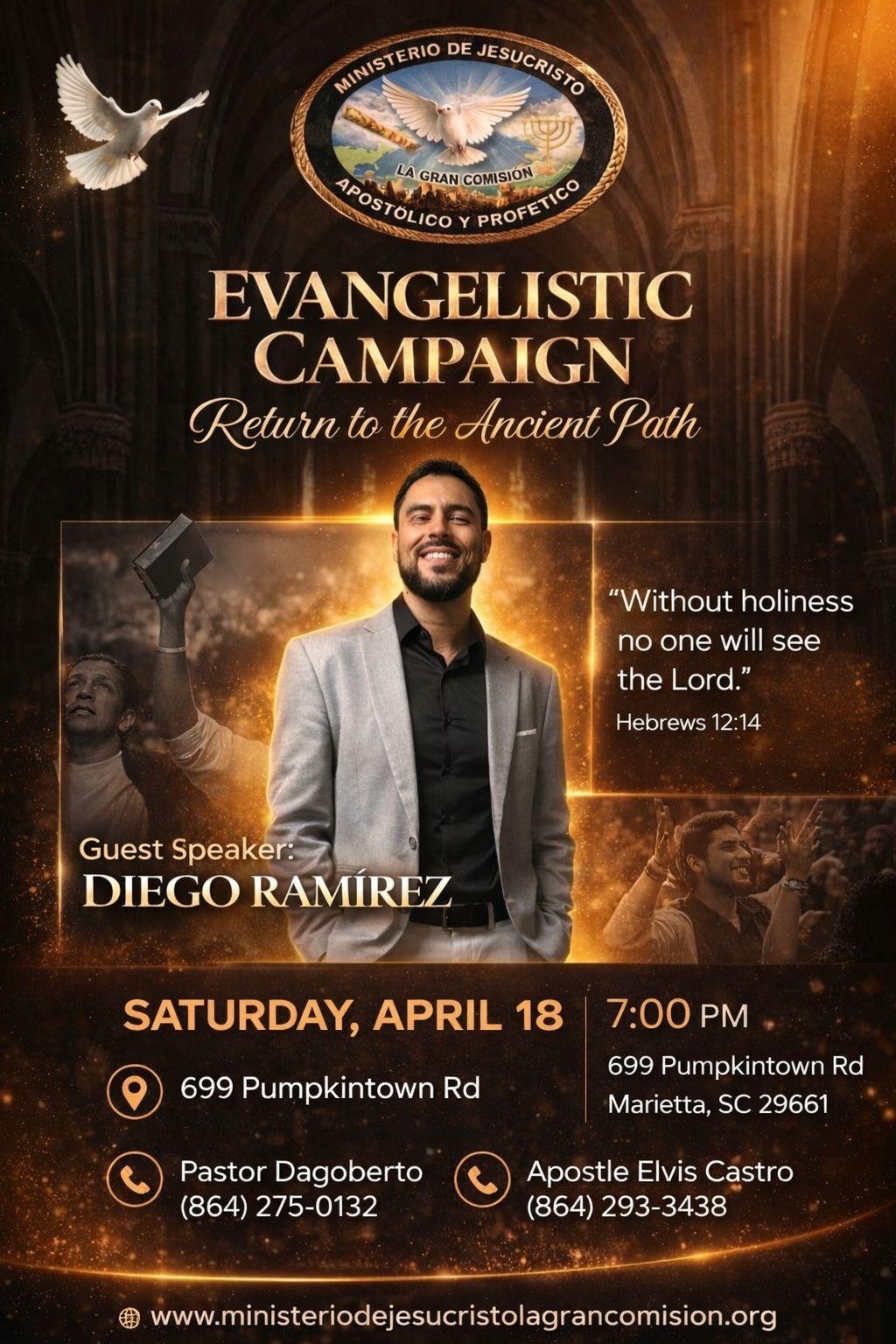 Nos alegra recibirte. El Pastor Dagoberto Ramires y el Apóstol Elvis Castro te invitan a ser parte de nuestra familia, donde crecerás en la fe, servirás con pasión y juntos cumpliremos la Gran Comisión.”